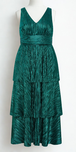 Make a lasting impression in this stunning Metallic Tier Dress. Complete with a flattering V neck, a micro pleat design, a tiered ruffle skirt and a cinching elastic waistband, this shimmering dress is set to accentuate your curves and ruffle while you strut.